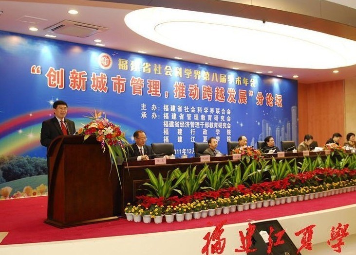2011年12月17日,由福建省社科联主办、省管理教育研究会和省经济管理干部教育研究会承办的省社科界第八届学术年会“创新城市管理,推动跨越发展”分论坛在我院举行。图为叶文振副院长致欢迎辞。