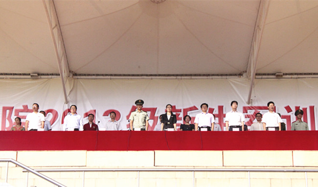 10月15日上午,我校2013级4630余名新生军训开训式分别在大学城田径场和金山校区运动场举行。校党委副书记、军训工作领导小组组长陈晓红,校长助理林清快,省武警总队直属支队副政委闵高满、副大队长王道仿,校相关部门负责人,各学院负责同志出席了开训式。开训仪式由武装部部长张湖北主持。