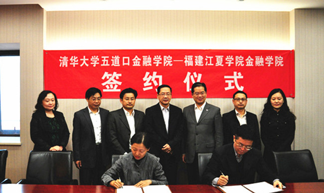 10月22日上午,清华大学五道口金融学院与我校金融学院签署了支持建设“海峡两岸互联网金融研究中心”的协议。清华大学五道口金融学院常务副院长廖理、党委书记兼副院长聂风华,我校郑建岚校长、校长助理林清快、金融学院负责人出席了签约仪式。合作协议的签署,将实质性推进清华大学金融学科对福建江夏学院的支援合作,发挥福建金融学院在两岸金融交流、金融研究、金融数理模型分析和福建金融改革实验区金融产品设计及产业化等方面的优势,在传统金融与以互联网为代表的现代信息科技相结合的新兴领域取得新的研究成果。