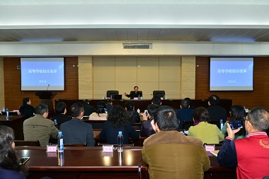 在专题辅导报告前,郑建岚校长简要介绍了学校近期赴省内外高校开展综合改革调研的情况,简析了学校开展综合改革的原因,剖析了学校在改革发展观念、人才培养特色、学科专业建设、科研成果转化、“双师双能型”队伍建设、目标责任传导落实、校院两级管理、干部和职称评聘等七大方面存在的深层次矛盾和问题,并在此基础上,提出了综合改革的初步构想。