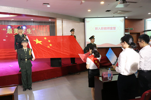 颁奖典礼上,今年新入职教师面对国旗庄严宣誓,在职教师与新入职年青教师一起重温誓词。全场师生一同观看了合唱、舞蹈、小组唱、诗朗诵、歌伴舞等精彩纷呈的文艺表演。