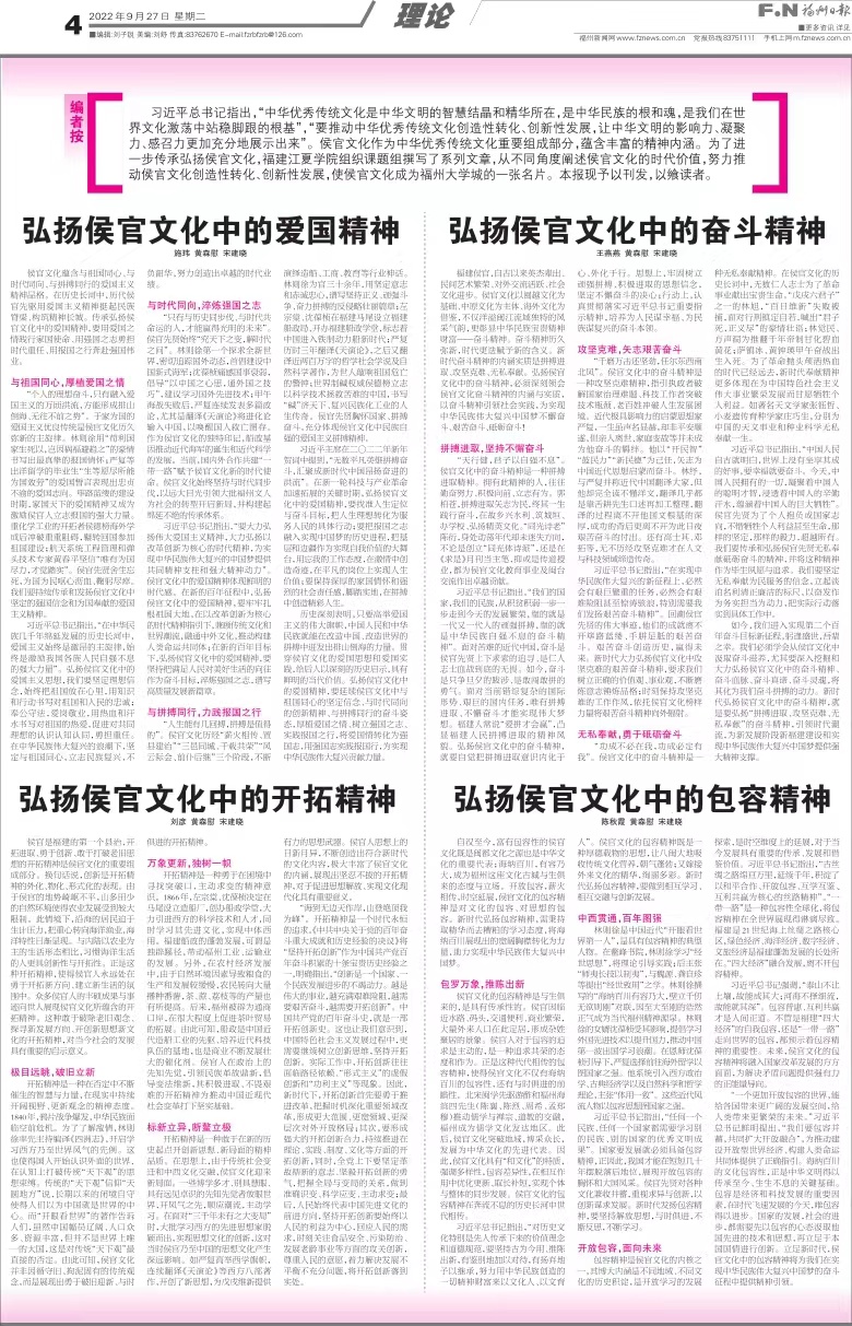 习近平总书记指出,“对历史文化特别是先人传承下来的价值理念和道德规范,要坚持古为今用、推陈出新,有鉴别地加以对待,有扬弃地予以继承,努力用中华民族创造的一切精神财富来以文化人、以文育人”。侯官文化的包容精神既是一种厚德载物的思想,让八闽大地吸收传统文化营养,朝气蓬勃;又嫁接外来文化的精华,绚丽多彩。新时代弘扬包容精神,要做到相互学习、相互交融与创新发展。