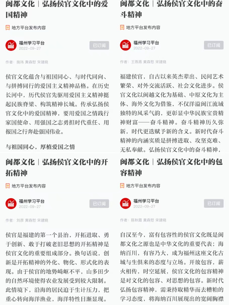 侯官文化蕴含与祖国同心、与时代同向、与拼搏同行的爱国主义精神品格。在历史长河中,历代侯官先驱用爱国主义精神挺起民族脊梁、构筑精神长城。传承弘扬侯官文化中的爱国精神,要用爱国之情践行家国使命、用强国之志勇担时代重任、用报国之行奔赴强国伟业。