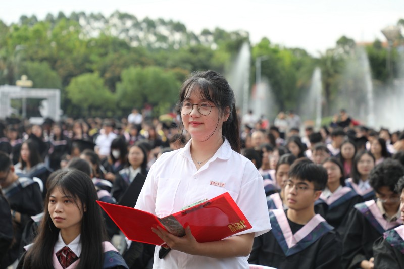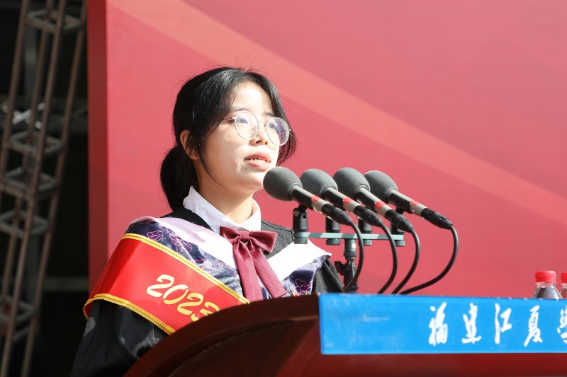 教师代表、法学院唐琳在发言中回忆了与毕业生们共同成长的点点滴滴,叮嘱即将启程的毕业生:要时刻“爱己”、莫忘“守序”、循序“建功”、谨记“立言”,常怀“博学于文,修身以德”校训,志存高远,脚踏实地,扎根基层,勇担历史赋予的重任。学生代表、设计与创意学院林倩茹发言,深情回顾在校学习生活的美好时光,表达了对学校、老师的感谢,表示将谨记母校的期望、老师的教诲、亲友的鼓励,走好未来的人生道路,以更加优异的成绩回报母校、奉献祖国。