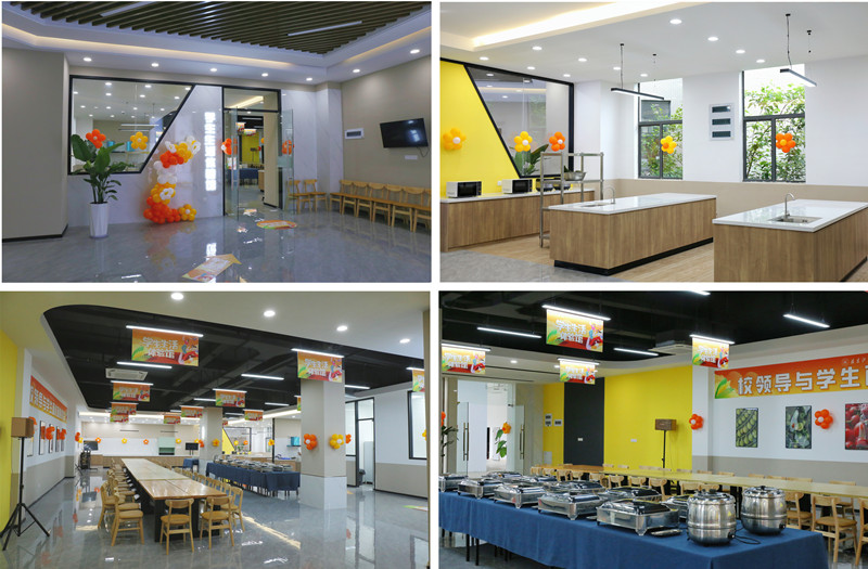 学生生活体验馆位于学校生活区一期学生食堂三楼,结合共享厨房特点进行设计,配备烹饪工作台、电磁炉、抽油烟机、微波炉、冰箱等厨房常用设施,并配套桌椅、灯箱以及景观绿植等软装,为学生提供一个劳动教育的阵地、一个交流学习的平台。