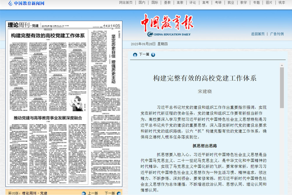 9月28日,《中国教育报》第5版“理论周刊·党建”刊发校党委书记宋建晓教授署名文章《构建完整有效的高校党建工作体系》。全文如下: