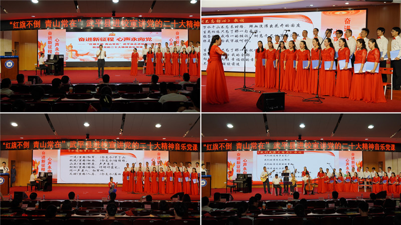 音乐党课分为“辉煌成就、伟大变革”“守正创新、凝心铸魂”“踔厉奋发、勇毅前行”三个篇章。王云川紧扣党的二十大精神进行宣讲,其间穿插一曲曲经典红歌、舞蹈、器乐合奏等表演,一张反映中国共产党百年来艰苦卓绝的革命历史画卷在现场师生面前徐徐展开。其中,歌曲《魅力武平》立足闽西革命老区苏区实际,赞颂新时代十年来在党的领导下,武平县人民走好振兴发展路的实际行动以及推动经济社会发展取得的显著成效。