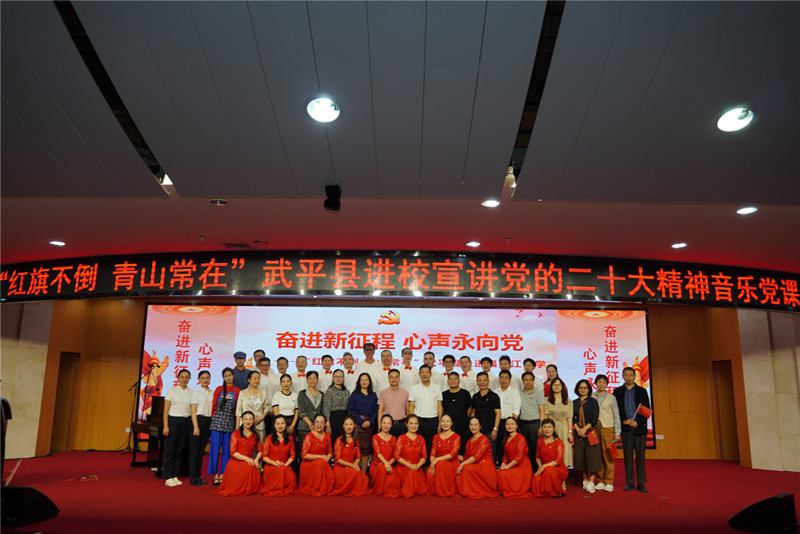 《没有共产党就没有新中国》《十送红军》《我们走在大路上》《不忘初心》《领航》……10月18日晚,一首首家喻户晓、催人奋进的经典旋律在福建江夏学院上空回荡。循着歌声走入学术报告厅,“奋进新征程,心声永向党”龙岩市武平县“红旗不倒·青山常在”赴省直部门宣讲党的二十大精神音乐党课福州大学城首场活动正在上演,台上主讲人与合唱演员倾情投入,台下师生全神贯注,阵阵掌声将现场气氛不时推向高潮。