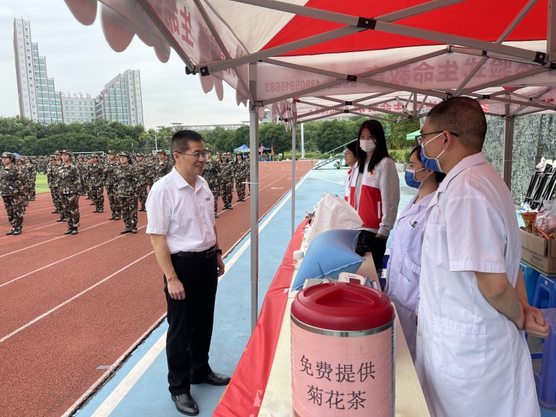 10月26日上午,校长、校征兵与军训工作领导小组组长凌启淡,校党委副书记、校征兵与军训工作领导小组副组长王长勇到军训现场看望承训教官和参训学生,了解军训进展情况,把学校党委的关心与慰问带到大家身边。