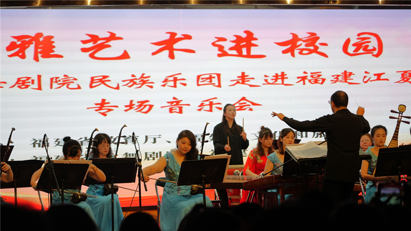 二胡、扬琴、琵琶、古筝、中阮、大阮、笙……这一件件古典乐器合奏出的《青花瓷》《小城故事》,甚至是经典动画片主题曲是一种什么感觉?11月6日晚,2023年福建省“高雅艺术进校园”活动来到福建江夏学院,来自省歌舞剧院民族乐团的20余名专业演员为我校700余名师生带来一场传统与现代交融的专场音乐会。