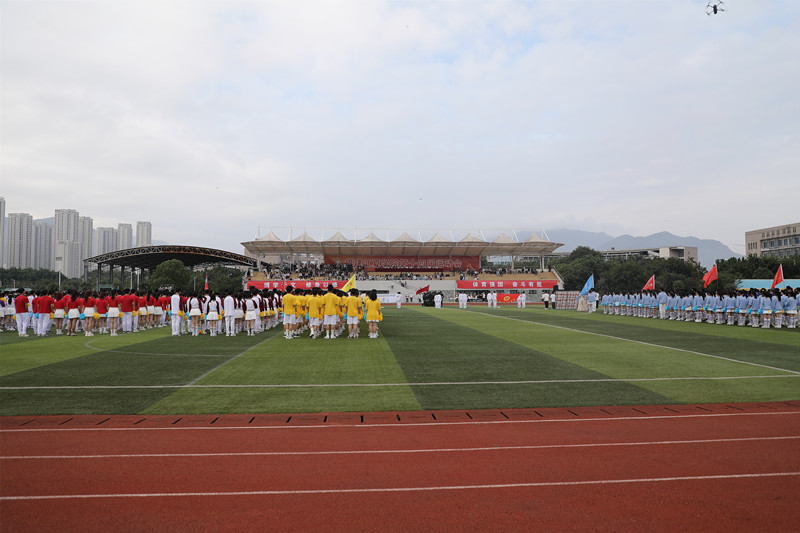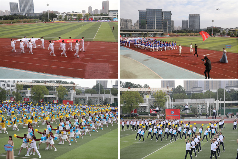 开幕式上,国旗护卫队、校旗护卫队、标语方阵、裁判员方阵、各学院方阵迈着矫健的步伐依次进场,各方阵利用道具、队形、表演、口号等形式展示学院特色,尽显师生昂扬向上的精神风貌和争创佳绩的进取决心。12个学院组成的千人啦啦操和“悦动青春,同爱同在”团体操“点燃”全场,大家踏着动感的旋律,变化流畅的队形,谱写着我校学子健康活力、奋力拼搏的青春诗篇。