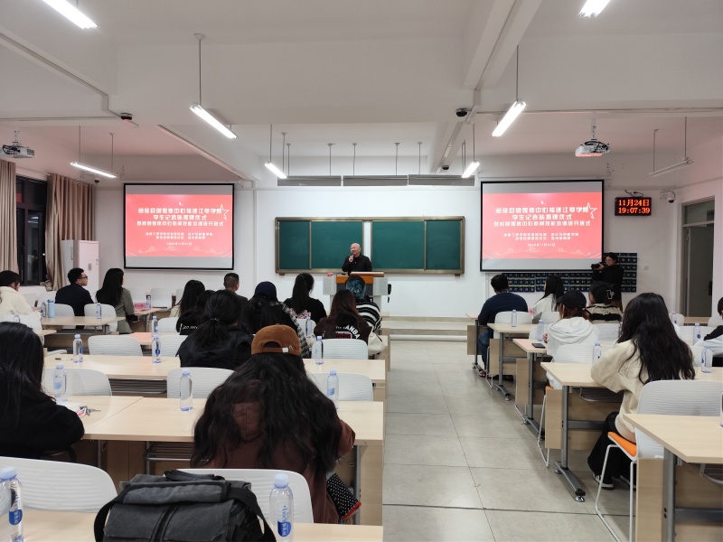 揭牌仪式后,举办校融媒体中心新闻技能培训班开班式。福州新闻网采集中心主管石磊磊为同学们作《“新闻眼”培养手册》讲座。
