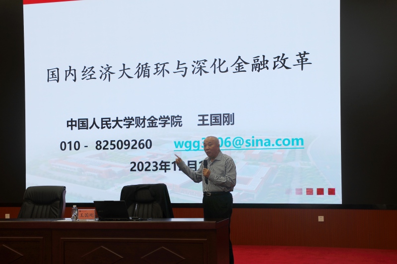 王国刚紧密结合习近平总书记在中央金融工作会议上的重要讲话精神,从国内大循环的提出、经济大循环基本理论的逻辑要点、实体经济循环中的内源融资、商业信用机制和横向金融体系、中国以银行信用机制为基础的纵向金融系统等五个方面作了详细阐述,并从发展横向金融系统的角度提出突破“金融是金融机构专有权”的观念约束、完善和规范票据市场、激活实体企业间的资金借贷机制、完善公司债券市场机制、完善金融监管机制等对策建议,为我国金融改革发展提供可资借鉴的宝贵经验。整场报告理论底蕴深厚,紧贴时事热点,对当今国内经济形势进行客观分析,见地深刻、解读精到,令在座师生眼界大开、受益匪浅。报告会后,王国刚还与师生们互动交流,就大家关心的经济、金融等问题释疑解惑。