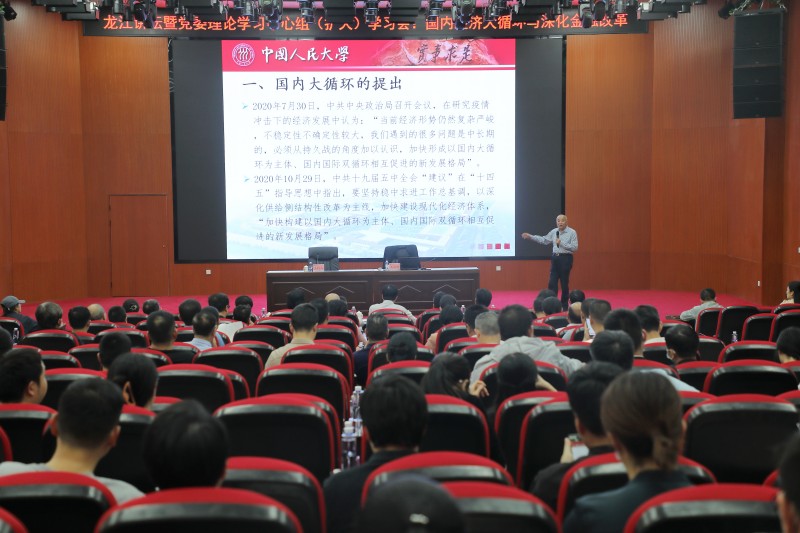 12月11日下午,我校举行龙江讲坛暨党委理论学习中心组(扩大)学习会,邀请中国社会科学院学部委员(国家一级教授)、中国社会科学院金融研究所原所长、享受国务院特殊津贴专家、中国人民大学财政金融学院博士生导师王国刚教授作“国内经济大循环与深化金融改革”专题辅导报告。校领导宋建晓、凌启淡、王长勇、刘慧宇、林学坚参加,会议由副校长朱四海主持。