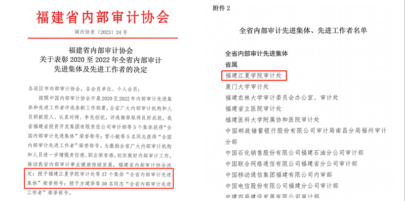 12月11日,福建省内部审计协会授予福建江夏学院审计处“2020至2022年全省内部审计先进集体”荣誉称号,为我校审计处首次获此殊荣。该荣誉每三年评选一次,是全省内部审计领域的最高荣誉。