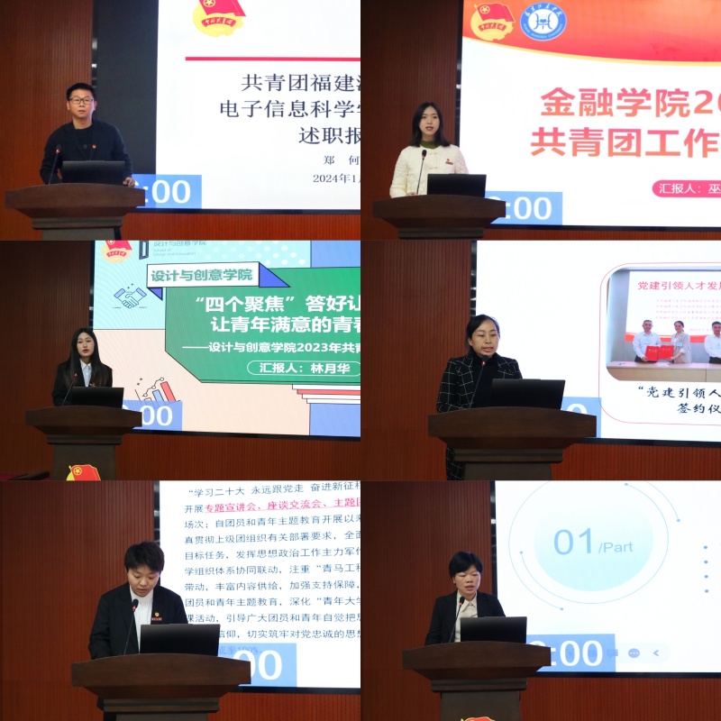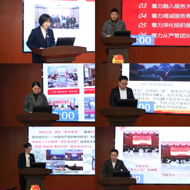 各二级学院团委负责人围绕团员和青年主题教育、引领凝聚青年、组织动员青年、联系服务青年等方面,对过去一年的共青团工作进行汇报,总结成绩、交流经验,剖析问题、谋划思路,充分展现了全校共青团队伍围绕中心、服务大局的工作作风和服务青年、务实担当的精神风貌。
