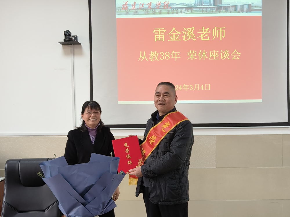 座谈会上,学院班子对雷金溪老师光荣退休表示敬意,对雷老师38年来的爱岗敬业、辛苦付出,对学校与学院的发展作出的贡献表示衷心感谢。雷老师严谨务实、真诚待人、无私奉献的工作作风在学院教师中起到了很好的榜样作用。希望雷老师继续关注支持学院的发展,祝愿雷老师心情舒畅、拥有一个健康快乐、充实幸福的退休生活。