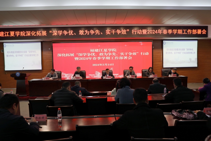 3月14日下午,学校召开深化拓展“深学争优、敢为争先、实干争效”行动暨2024年春季学期工作部署会,深入学习贯彻习近平新时代中国特色社会主义思想,落实全省“深学争优、敢为争先、实干争效”行动总结部署会精神,部署我校2024年春季学期工作。校党委副书记、校长凌启淡作动员部署讲话。全体在家校领导出席会议。