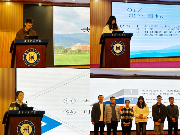 19级投资班彭文杰、20级金融学(融资租赁方向)班赵林旖、20级经济统计学2班苏芯瑜等3位同学以自己成功考取研究生、公务员的经历,向21级同学分享自己备考过程中的点滴经验,包括学习计划的制定、各阶段时间的合理分配和应对压力的方法,为同学们提供了实用的建议和鼓励。