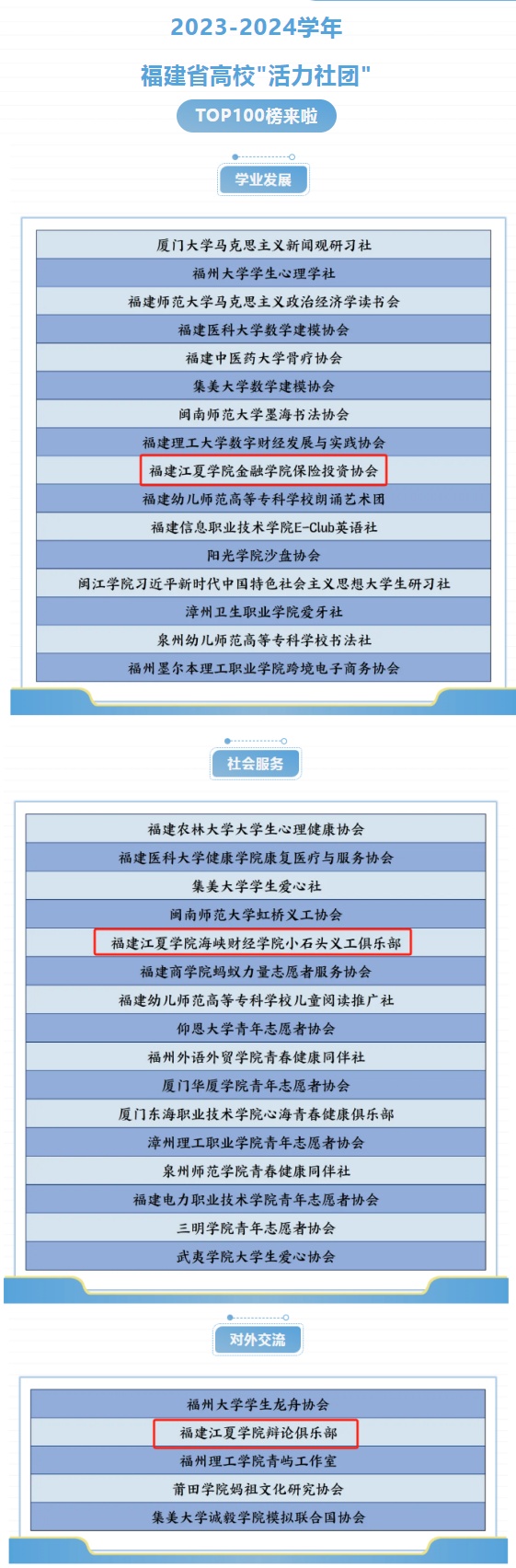 近日,共青团福建省委发布福建省高校“活力社团”TOP100榜。我校辩论俱乐部、金融学院保险投资协会、海峡财经学院小石头义工俱乐部3个学生社团入选。