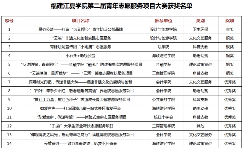 比赛中,入围决赛的14个项目参加路演答辩,聚焦理论政策宣讲、文化文艺服务、科普支教、卫生环保、助老助残等领域进行精彩展示,并角逐出金奖1个、银奖2个、铜奖3个、优秀奖8个。