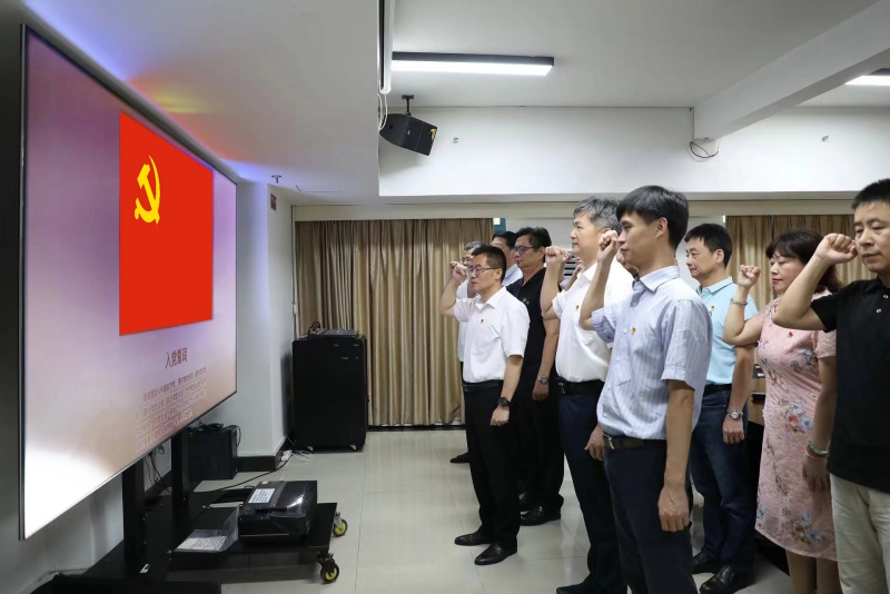 校党委副书记、校长凌启淡带领参会全体党员重温入党誓词。大家佩戴党员党徽、面向党旗,高举右拳、庄严宣誓,用铮铮誓词宣示了马克思主义信仰、共产主义信念以及对党和人民的忠诚,以及赓续中国共产党人精神血脉的决心。