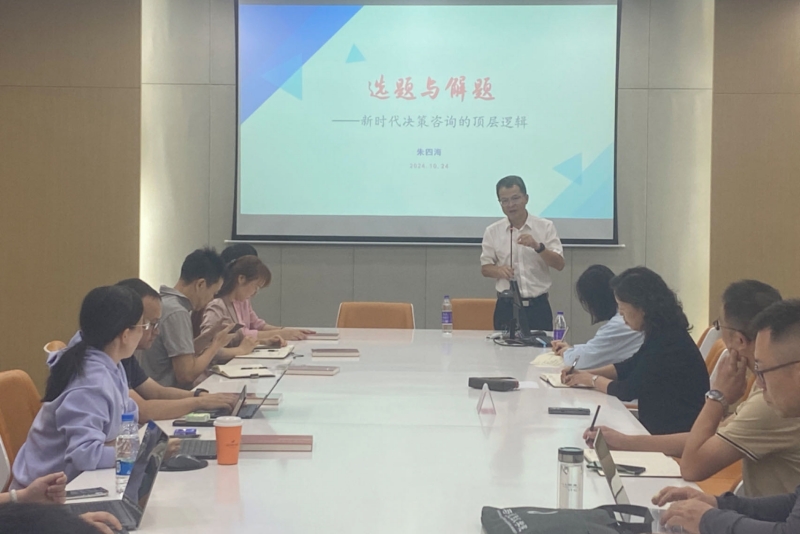 10月24日上午,副校长朱四海在图书馆一楼会议室作“选题与解题—新时代决策咨询的顶层逻辑”主题报告。科研处、学校决策咨询专班全体成员、学校科研创新团队负责人30余名教师参加交流研讨。