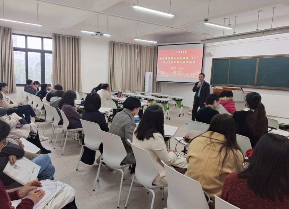为全面贯彻全国教育大会、全国高校思想政治工作会议 精神,落实立德树人根本任务,推进课程育人工作,根据《福建江夏学院课程思政建设工作方案》和《关于开展2024年“课程思政月”活动的通知》文件精神,11月25日下午学院在201教室举办校级课程思政示范课程“1+1”结对子团队联合教研活动,以“课程思政建设交流会”为主题,活动由宋志强副院长主持,我院30余名教师和马克思主义学院郑元叶教授等三位教师代表参会。