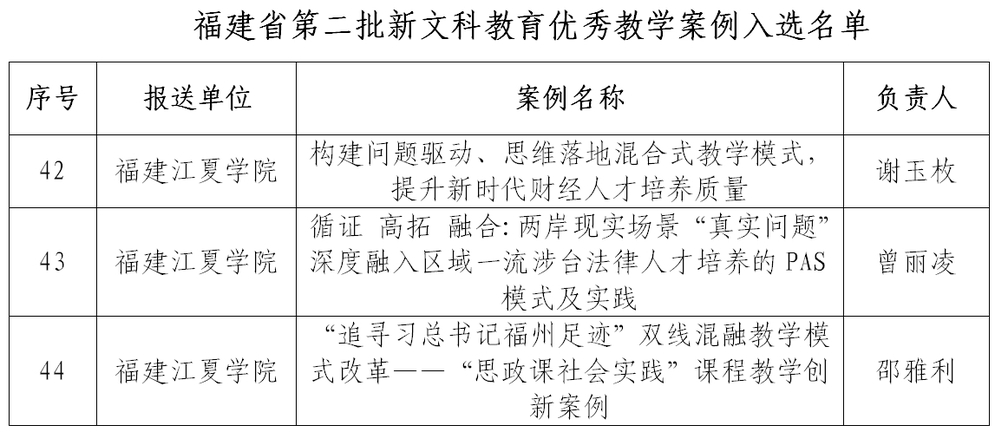 近日,福建省新文科教育研究中心公布了省第二批新文科教育优秀教学案例征集入选名单,我校3个案例成功入选。