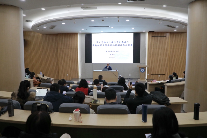 12月19日上午,第十二、十三届全国人大常委会委员、著名财税专家、厦门大学、厦门国家会计学院邓力平教授应邀莅临我校宣讲党的二十届三中全会精神。讲座由校长凌启淡主持,副校长朱四海参加讲座。科研处、会计学院师生代表110多人现场聆听讲座。