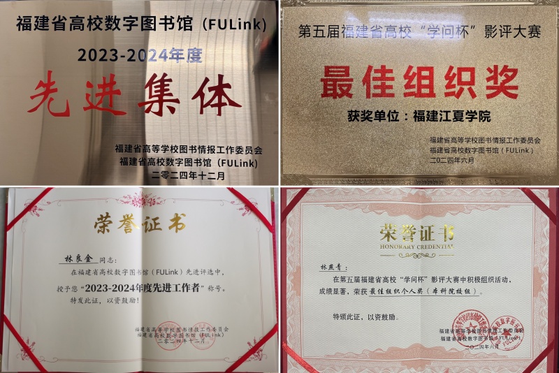 12月18日,福建省高校图工委2024年年会在福州大学举行。我校图书馆荣获福建省高校图书馆2023-2024年度先进集体、第五届福建省高校“学问杯”影评大赛最佳组织奖,图书馆林良金老师荣获2023-2024年度先进工作者、林燕青老师荣获第五届福建省高校“学问杯”影评大赛最佳组织个人奖。