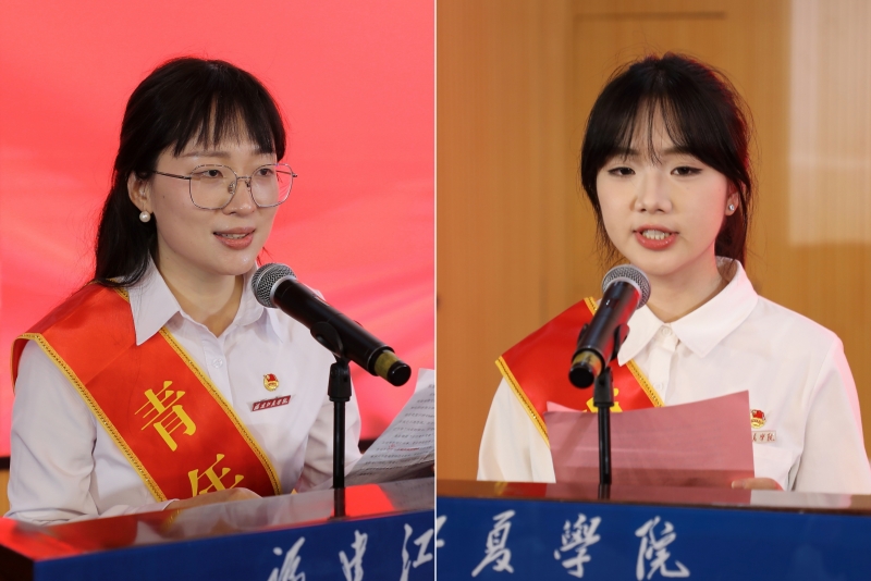 校青年五四奖章获奖代表黄凌云老师,优秀学生共青团员干部代表陆诗璇同学分别发言。