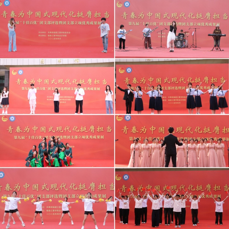 会后,校领导与青年学生一起参加校第九届“十佳百优”团支部评选暨立项优秀成果展,68个班级、学生组织、学生社团团支部进行风采展示,并现场为获奖支部代表、校“十佳社团”颁奖。团员青年们展演了小组唱、歌曲串烧、朗诵、健身操等节目,充分彰显出我校青年自信阳光、朝气蓬勃的精神风貌。