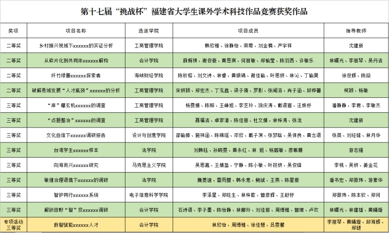 日前,第十七届“挑战杯”福建省大学生课外学术科技作品竞赛闭幕式暨颁奖仪式在福州大学举行。我校共获奖13项,其中,主体赛二等奖4项、三等奖8项;竞赛配套专项活动——2025年福建省高校“科创类”社团精品项目评选三等奖1项。