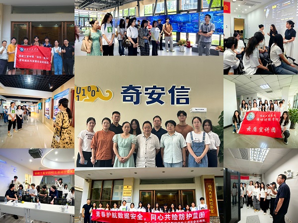 现代教育技术中心重视探索教辅单位职能的内涵建设。7月4-5日,技术中心联合闽侯县人民检察院、校友企业福建润禾电子科技有限公司等多家共建学校网络安全宣传走廊的单位,紧扣“网络安全”主题,为海峡财经学院、电子信息科学学院和法学院分别组建的“云盾”社会实践团队、“法治·数智”青年成长与发展社会实践团队的近30名学生,先后安排了包括位于大数据科技园的奇安信科技集团股份有限公司、大学城检察室、福建金瑞信息技术有限公司以及校内网络数据中心等多场研学活动。现场考察、专家讲座和交流等多种实践方式,帮助学生们逐步了解网络安全行业的发展情况,我国信息技术应用与创新的前景,以及市场、社会和司法机关对复合型人才的真实需求。电子信息科学学院郑薇玮博士、法学院潘书宏博士以及海峡财经学院的团委负责人参与了现场指导。