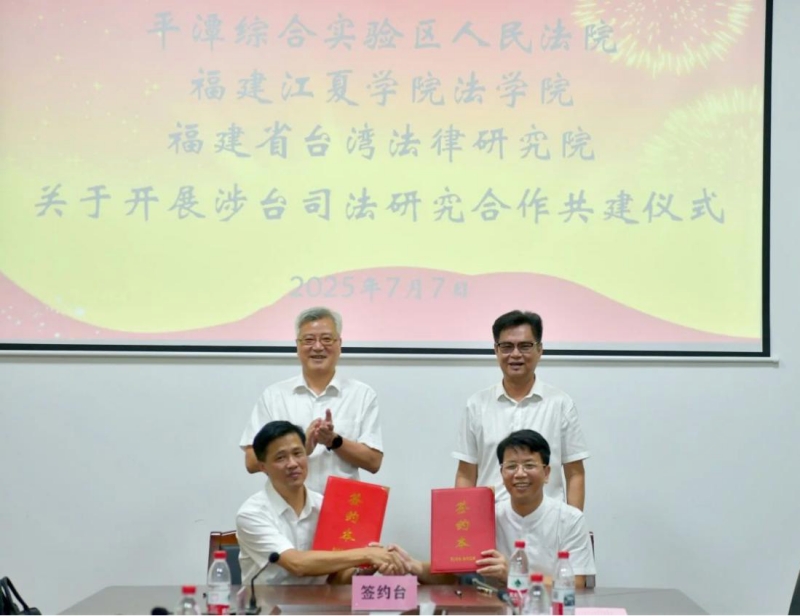 7月7日上午,福建江夏学院法学院、福建省台湾法律研究院与平潭综合实验区人民法院开展涉台司法研究合作共建签约仪式。福建江夏学院党委副书记王长勇,平潭法院党组书记、院长董宇,党组成员、副院长陈兴出席仪式。平潭法院和福建江夏学院法学院、福建省台湾法律研究院相关专家和教师代表参加仪式。