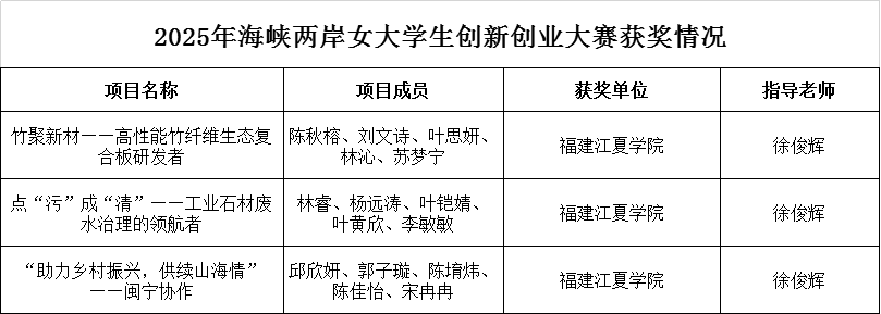 我校获奖项目不仅在技术研发与社会服务方面展现出扎实基础与前瞻视野,也体现了我校在推动专创融合、服务社会发展方面的积极探索。学校将继续搭建两岸青年交流平台,强化校企合作与成果转化机制,鼓励更多女大学生投身创新创业实践,为推动海峡两岸融合发展、服务地方经济社会发展持续贡献青春力量。
