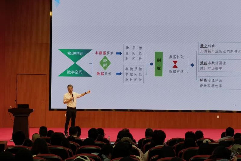 朱四海以“数据要素与可信数据空间”为题,沿着“为什么是数据、如何配置数据、如何使用数据”主线,深度解析了数字经济时代数据的核心价值与应用路径,重点讲解主流经济形态演变,数据要素发展成为数字经济时代主导要素的经济逻辑;以现代化动力机制和要素市场化配置改革视角,深度阐述数据要素市场培育建设的制度基础、市场规制、改革试点政策;基于数据驱动和高质量数据集,并落到数据赋能“福品消费”,系统剖析可信数据空间问题。宋志刚以“发挥数据要素与人工智能叠加赋能作用,打造高质量发展的新质生产力”为题,深入剖析数据要素与人工智能在推动数字经济高质量发展中的协同效应;详细阐述数据要素的高流动性、高敏感性等特征,及其对企业创新效率、决策优化、市场需求预测的重要作用。作为“数字东南”系列讲座的开篇之作,不仅为师生带来了数字经济前沿理论与实践案例,更搭建了学院与业界的合作桥梁,为学院专硕点申报与人才培养模式创新提供了宝贵的行业视角。